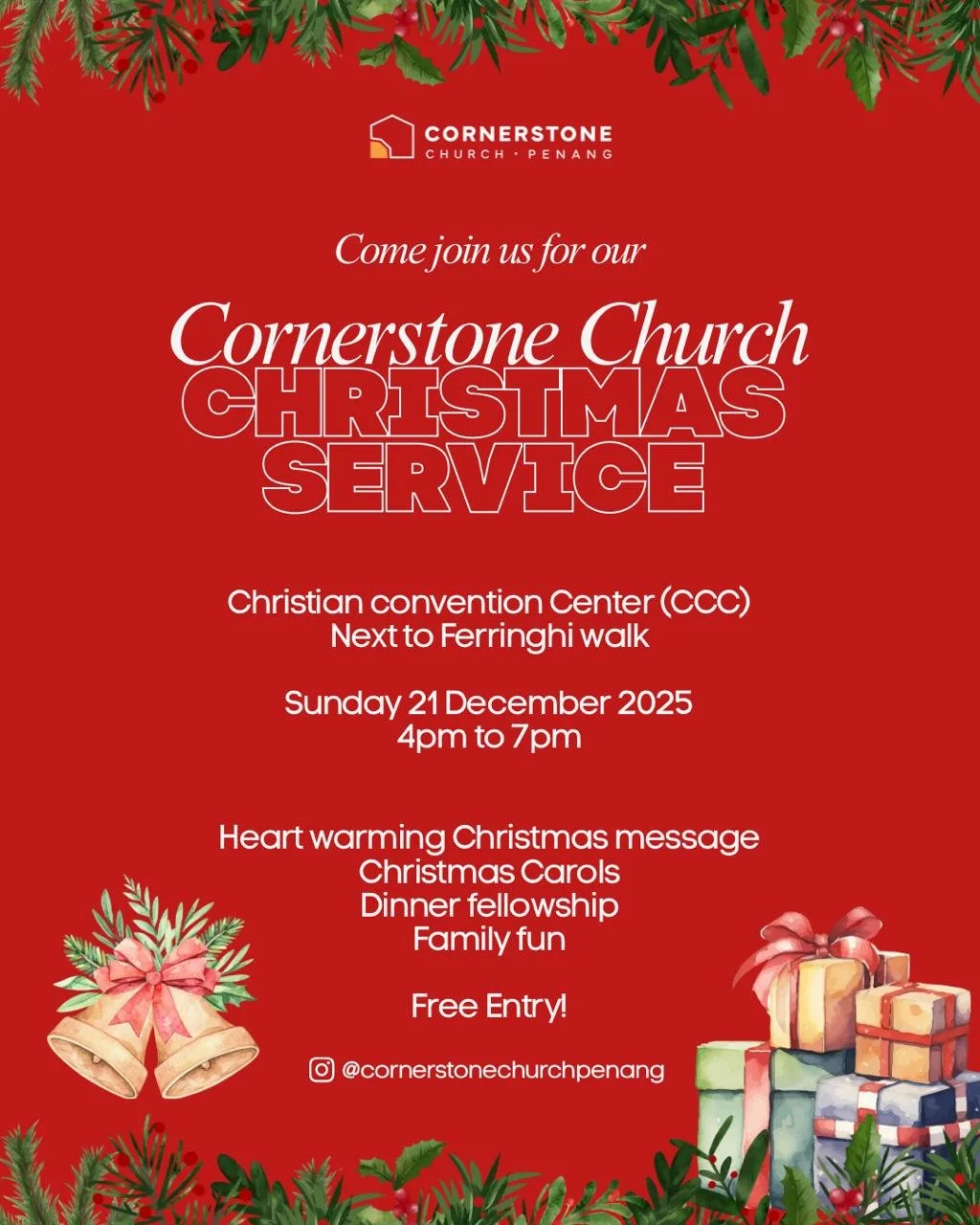 Every Sunday service at 4pm at CCC in Batu Ferringhi.